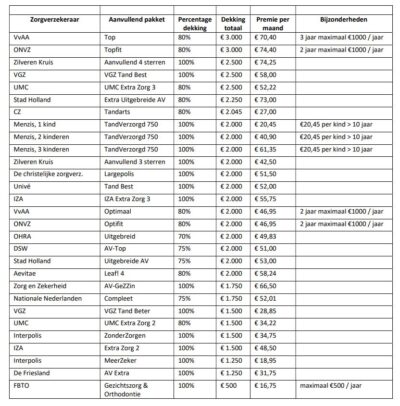 Raadpleeg voor een compleet overzicht een vergelijkings-website zoals: www.zorgwijzer.nl/vergoeding/orthodontie-tot-18-jaar en raadpleeg s.v.p. altijd de polisvoorwaarden van de betreffende zorgverzekeraar als u zeker wilt zijn van de informatie.